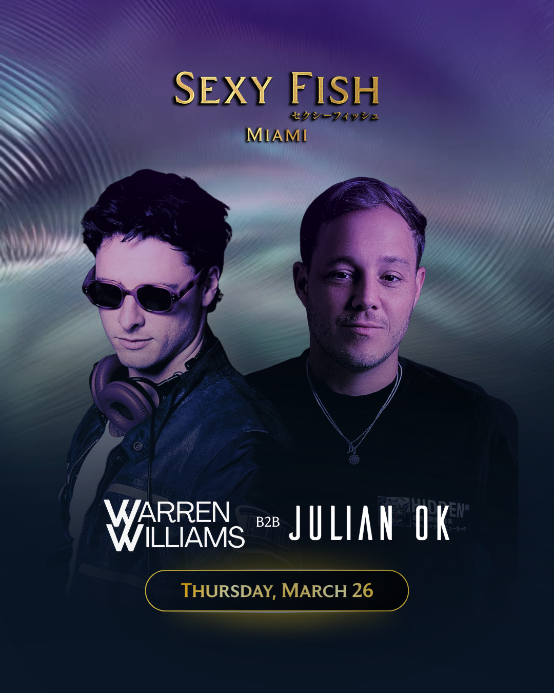 The weekend kicks off with resident DJ’s Warren Williams B2B Julian OK behind the decks. Familiar forces at Sexy Fish, they bring a refined, rhythm-forward set designed to carry Music Week deep into the night.
